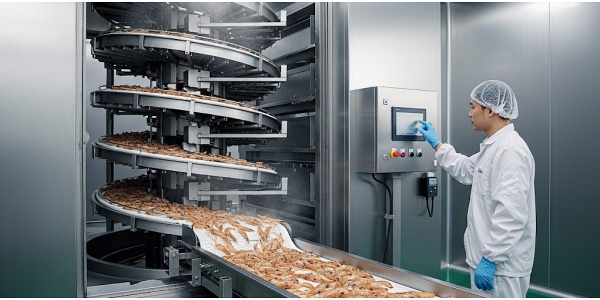 The new spiral freezer achieves the target capacity of 2,000 kg/hr, producing high-quality IQF shrimp with a dehydration rate below 1%. The freezing time per batch was reduced by 60%, significantly boosting overall production efficiency.